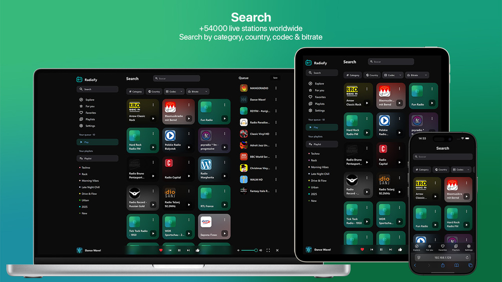 - Global Station Search – Search by country, genre, codec or bitrate.